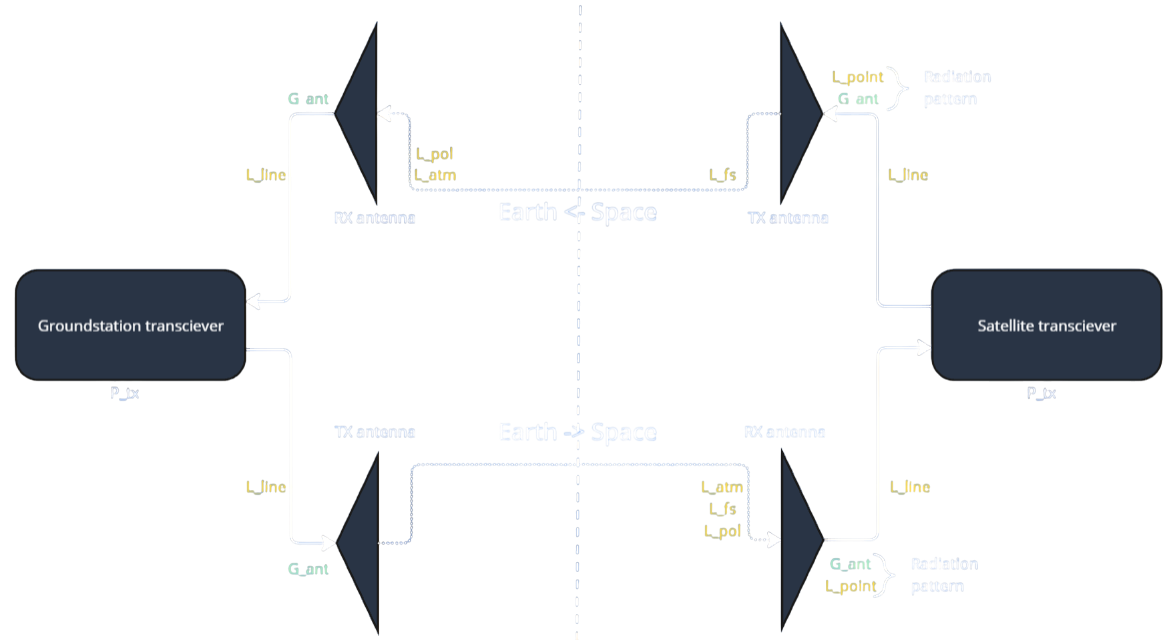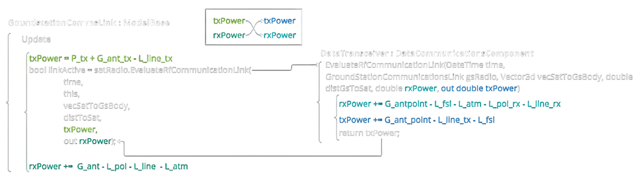 Figure 4: An overview code diagram of the interactions between the D2S2 ground station and satellite transceiver models. In the diagram, how the parameters are summated in the calculation of the received signal is made apparent and can be used to more directly follow the path presented in Figure 3. Critically, note that all parameters are expressed in decibel format.